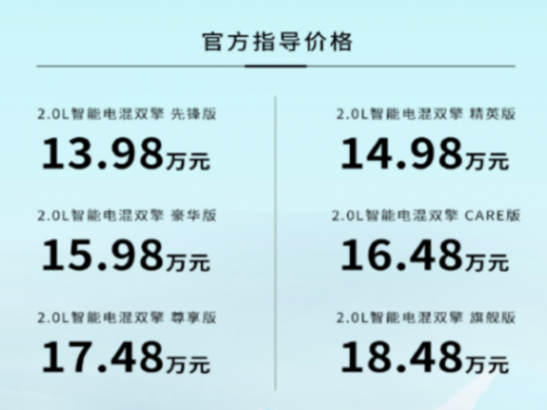 價格方面,先鋒版售價13.98萬元;精英版售價14.98萬元;豪華版售價15.98萬元;CARE版售價16.48萬元;尊享版售價17.48萬元;旗艦版售價18.48萬元。