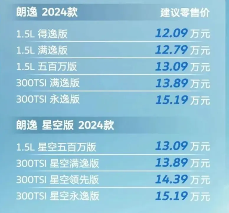 2024款大眾朗逸上市,配1.5L/1.5T發(fā)動(dòng)機(jī),售價(jià)12.09萬-15.19萬