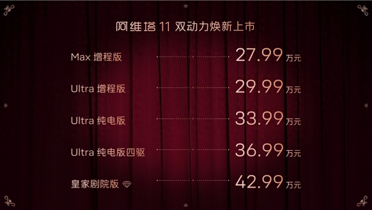 2024年12月2日,阿維塔科技宣布,未來(lái)智能豪華SUV——阿維塔11正式推出增程車(chē)型,純電車(chē)型也全面煥新。新車(chē)共兩種動(dòng)力五款車(chē)型,官方售價(jià)27.99萬(wàn)元起;皇家劇院版售價(jià)42.99萬(wàn)元。自此,阿維塔成為了行業(yè)唯一一個(gè)全系提供增程、純電雙動(dòng)力選擇的高端品牌。即日起,用戶可通過(guò)阿維塔App、阿維塔官網(wǎng)、阿維塔小程序以及全國(guó)各大城市的門(mén)店等官方渠道進(jìn)行訂購(gòu),上市即交付。