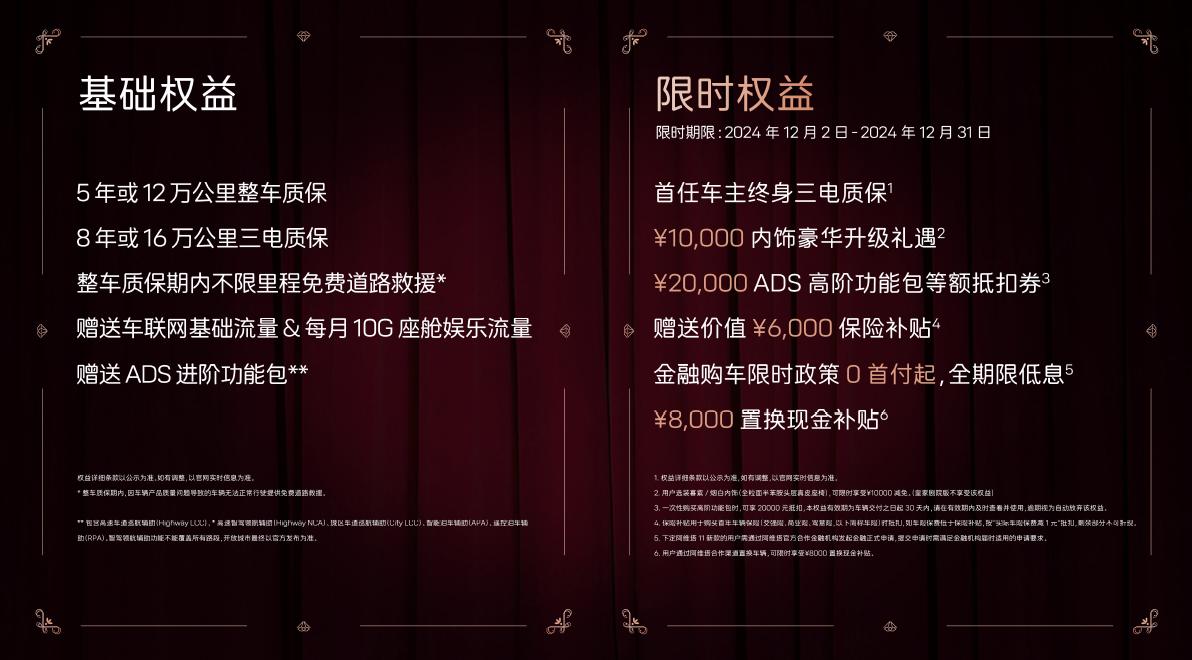 與此同時(shí),針對(duì)本次阿維塔11的上市,阿維塔還推出了重磅購(gòu)車(chē)禮遇,2024年12月31日前大定用戶可享六大限時(shí)權(quán)益:首任車(chē)主終身三電質(zhì)保、10000元內(nèi)飾豪華升級(jí)禮遇、20000元ADS高階功能包等額抵扣券、價(jià)值6000元的保險(xiǎn)補(bǔ)貼、0首付起全期限低息、8000元置換現(xiàn)金補(bǔ)貼。此外,還可享五大基礎(chǔ)權(quán)益:5年或12萬(wàn)公里整車(chē)質(zhì)保、8年或16萬(wàn)公里三電質(zhì)保、整車(chē)質(zhì)保期內(nèi)不限里程免費(fèi)道路救援、贈(zèng)送車(chē)聯(lián)網(wǎng)基礎(chǔ)流量和每月10G座艙娛樂(lè)流量、贈(zèng)送ADS進(jìn)階功能包。