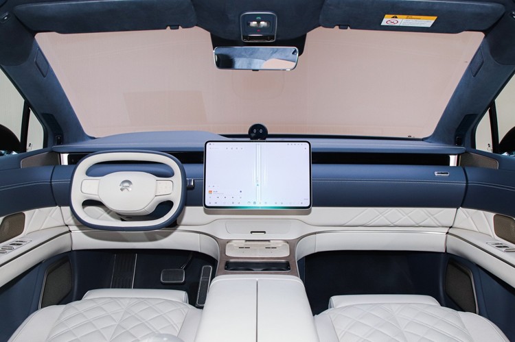進入蔚來ET9的車內,可以看出蔚來ET9的內飾采用了極其簡潔的設計,最大亮點是首次搭載了Skyline天際線屏幕,在主、副駕兩側均可以顯示車輛信息,副駕側也能夠完成一定的娛樂需求,這點還是很不錯的。