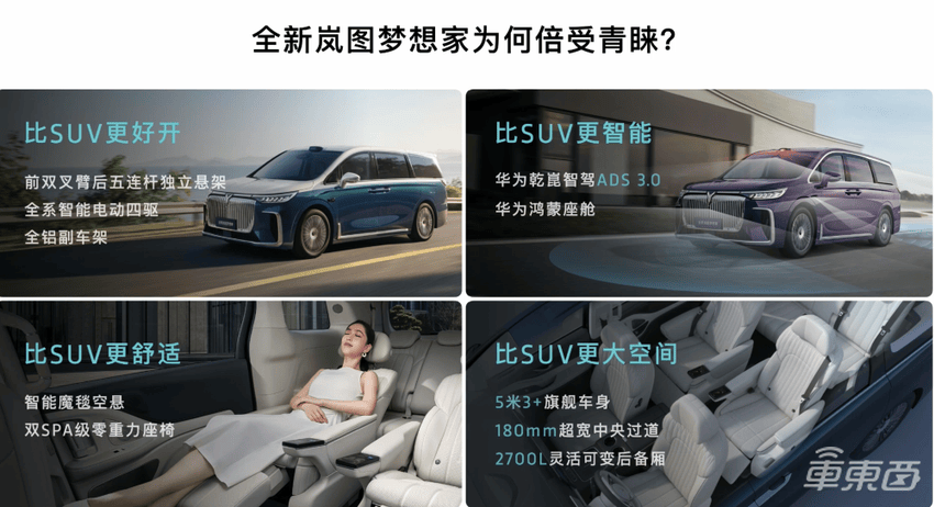此次嵐圖夢想家上市的新車型為搭載華為鴻蒙智艙和乾崑智駕的四驅卓越乾崑版和四驅尊貴乾崑版,售價為35.99至40.99萬元。