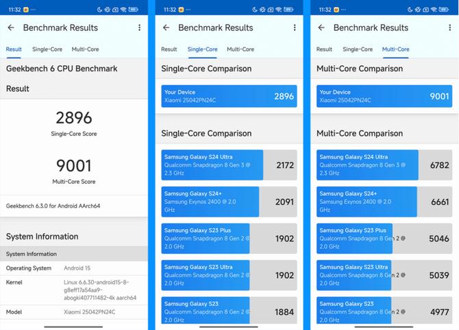 另外一項性能測試中可以看到,小米15S Pro的GeekBench 6的測試中可以看到單核心的分數為2896,多核心的分數為9001,這樣的性能表現相對上代高通驍龍8Gen3單核心性能領先超過33%,多核心性能領先32.7%,和現階段的旗艦高通驍龍8至尊版也是完全在同一水平線上的。