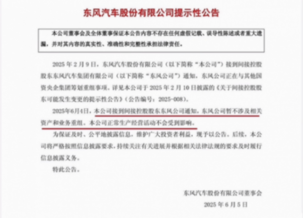 東風(fēng)汽車這邊的內(nèi)容是:6月4日接到通知,東風(fēng)公司暫不涉及相關(guān)資產(chǎn)和業(yè)務(wù)重組,公司正常經(jīng)營不受影響。