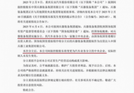 而長安汽車這邊的內(nèi)容就比較炸裂了:經(jīng)國務(wù)院批準(zhǔn),對兵器裝備集團(tuán)實施分立,其汽車業(yè)務(wù)分立為一家獨立中央企業(yè)。