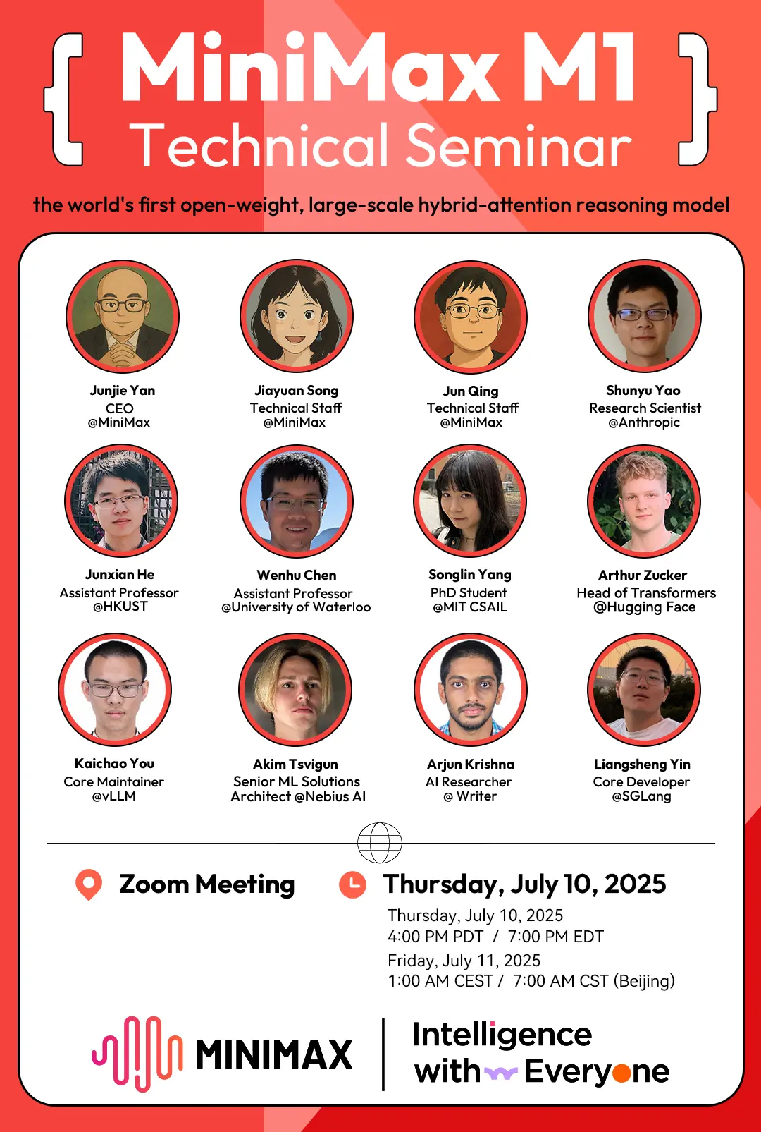 7月10號(hào),MiniMax面向全球舉辦了M1技術(shù)探討會(huì)。作為中國(guó)團(tuán)隊(duì),我們很高興組織發(fā)起與全球?qū)W者的開放技術(shù)探討。現(xiàn)場(chǎng),來自十幾個(gè)國(guó)家地區(qū)的觀眾從世界各地加入,與M1團(tuán)隊(duì)和全球?qū)W者進(jìn)行了技術(shù)交流。