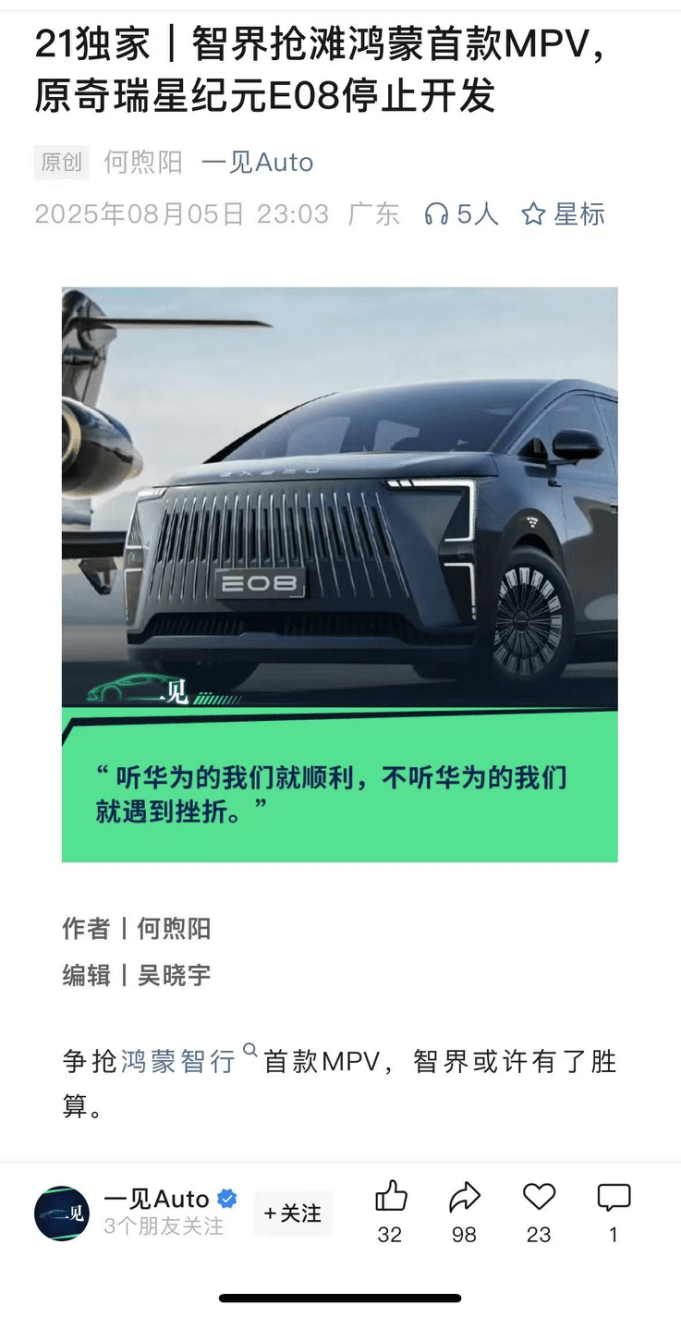 消息稱奇瑞星途星紀元E08已停止開發,為鴻蒙智行智界首款MPV讓路