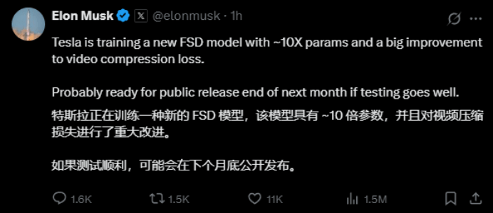 馬斯克宣布特斯拉正在訓練新FSD模型:十倍參數提升,最快下月底向公眾發布