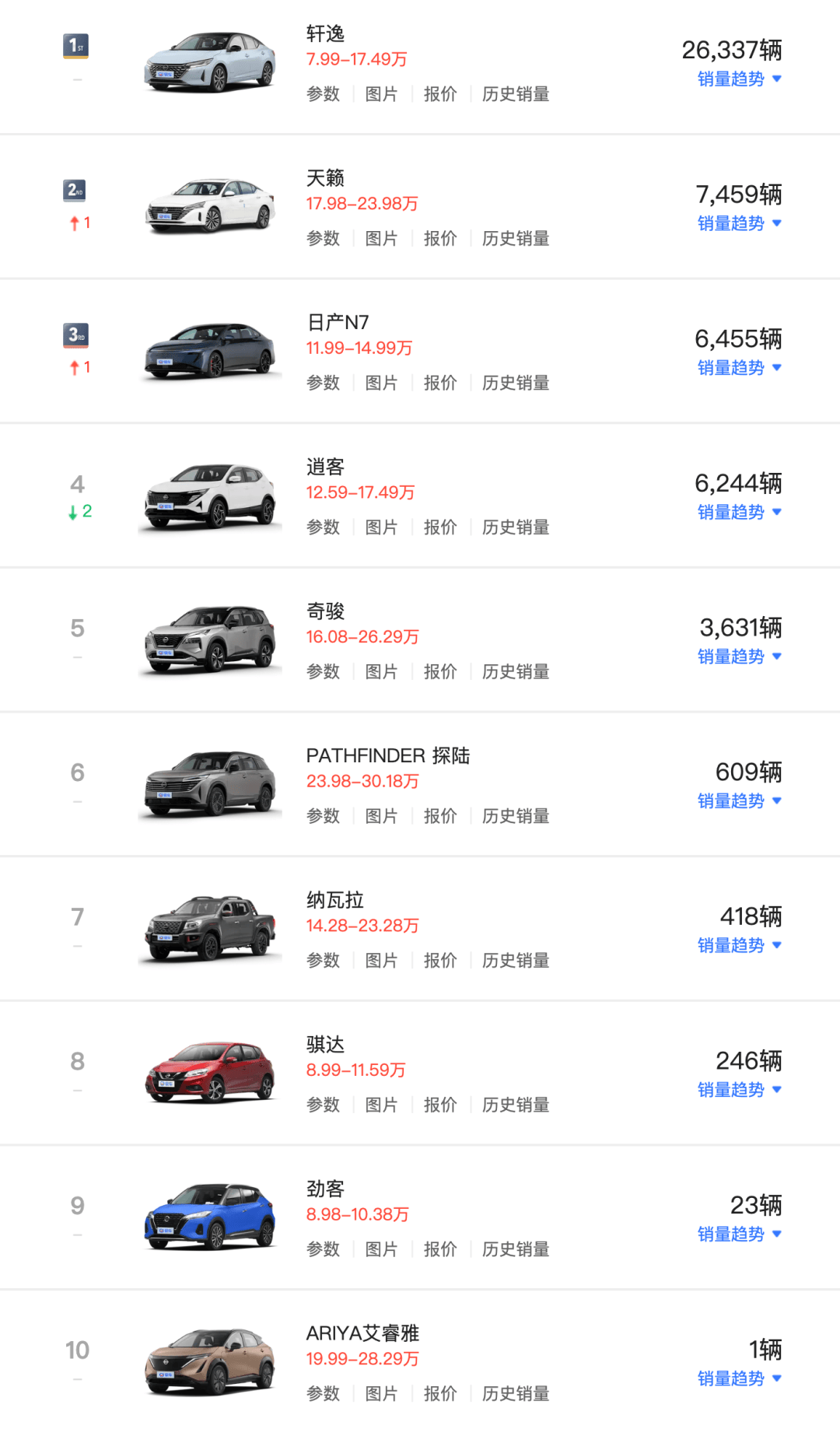 細(xì)分車型來看,7月日產(chǎn)汽車在華產(chǎn)品僅有一款車型零售銷量過萬,軒逸銷量為2.63萬輛,其它車型銷量均低于萬輛。其中,進(jìn)入前五名的天籟、日產(chǎn)N7、逍客、奇駿銷量分別為7459輛、6455輛、6244輛、3631輛。