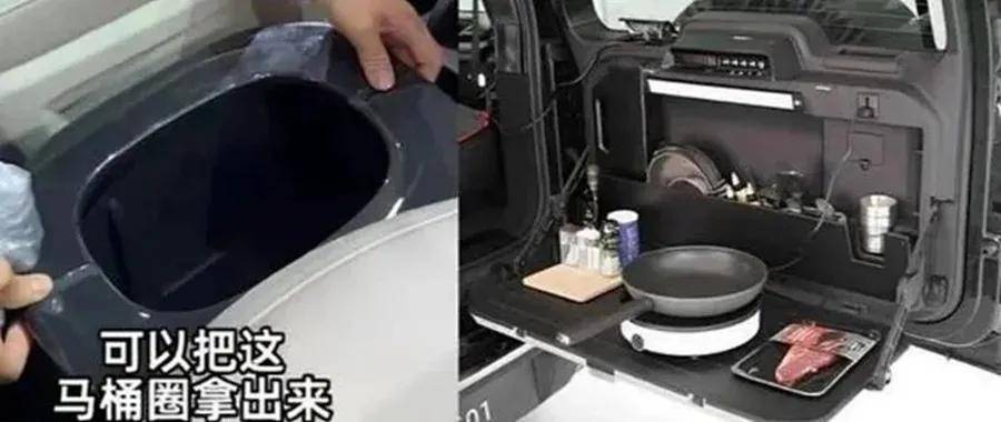 極石01的操作更加離奇,把中央儲物箱改造成可拆卸車載馬桶,配上除臭凝膠號稱解決“戶外三急”,再搭配折疊車載廚房、釣魚套件,試圖靠獵奇賣點出圈。